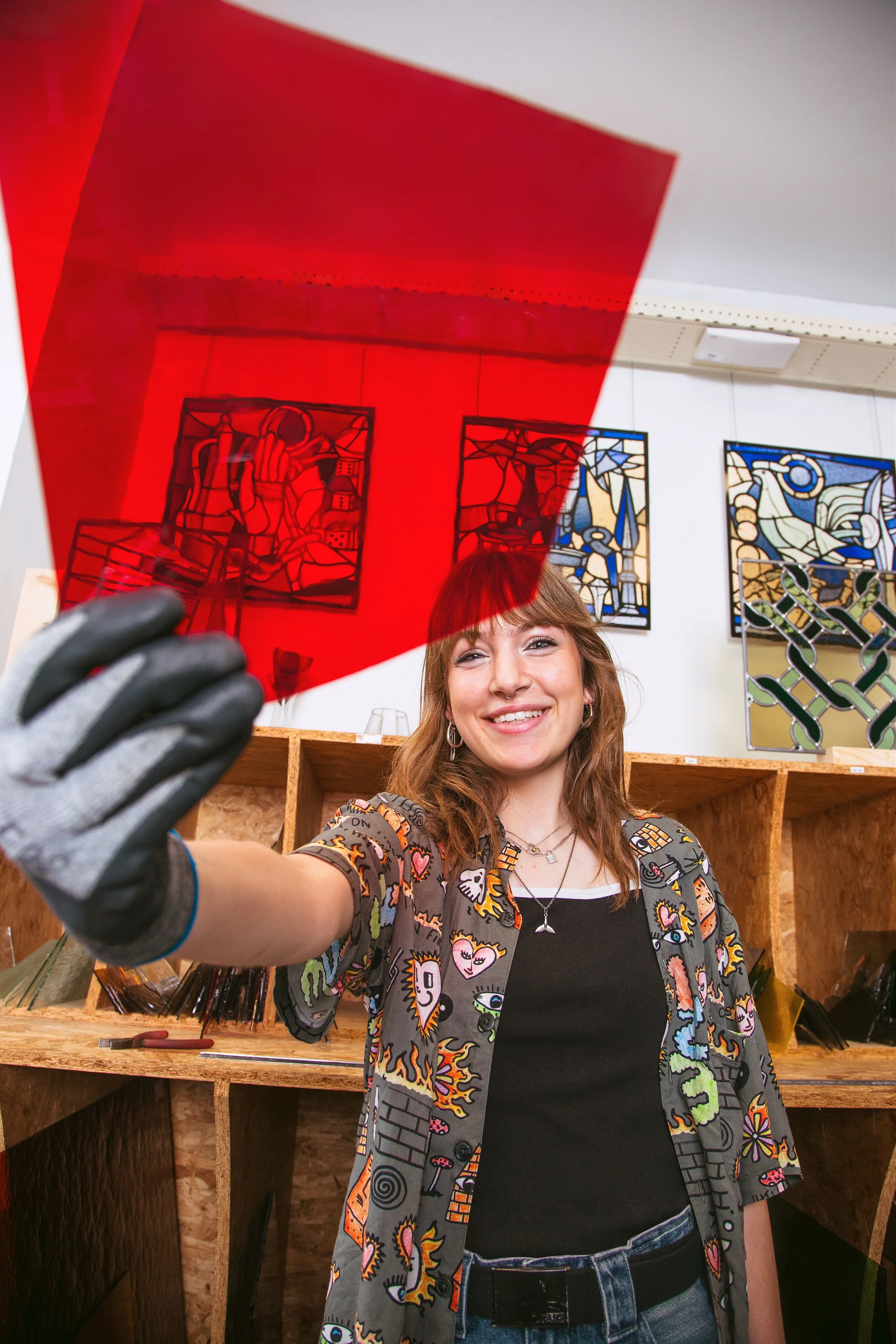 A young woman with red hair wearing pink and white sunglasses, a red satin jacket, standing in front of a white and blue wall.