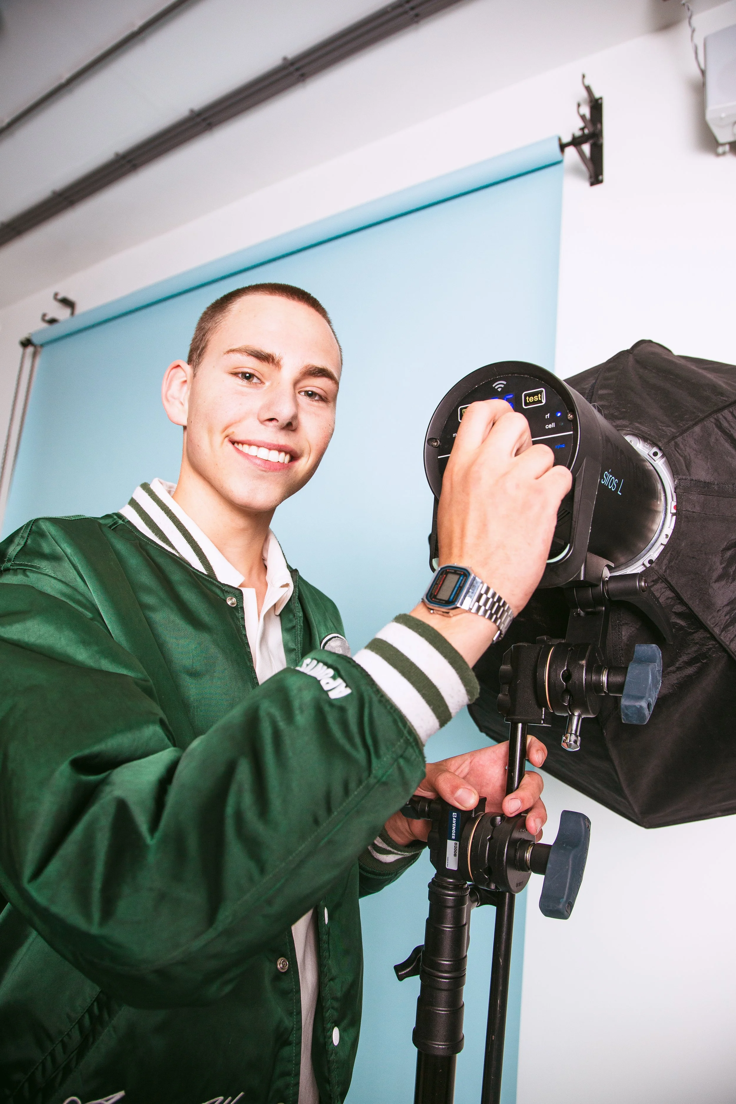 A man in sunglasses and colorful clothing standing on a wooden chest in front of a white wall with a framed poster of Akira.