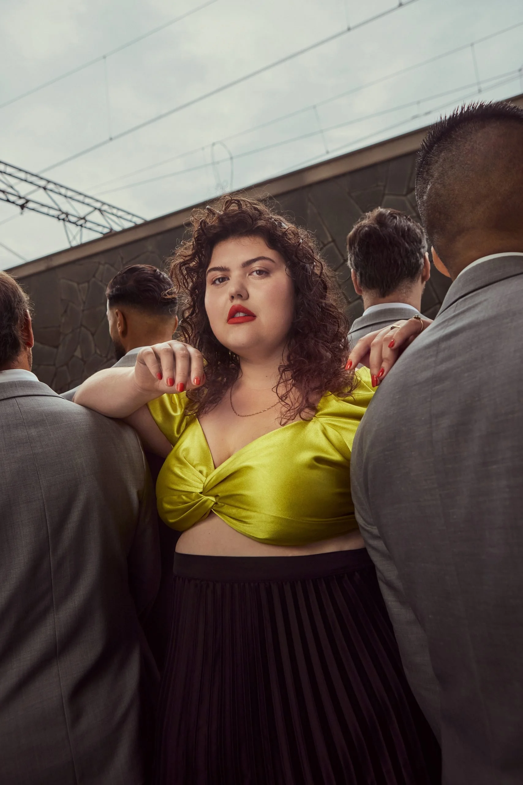 A confident woman with curly brown hair and red lipstick posing among men in suits at an outdoor train station.