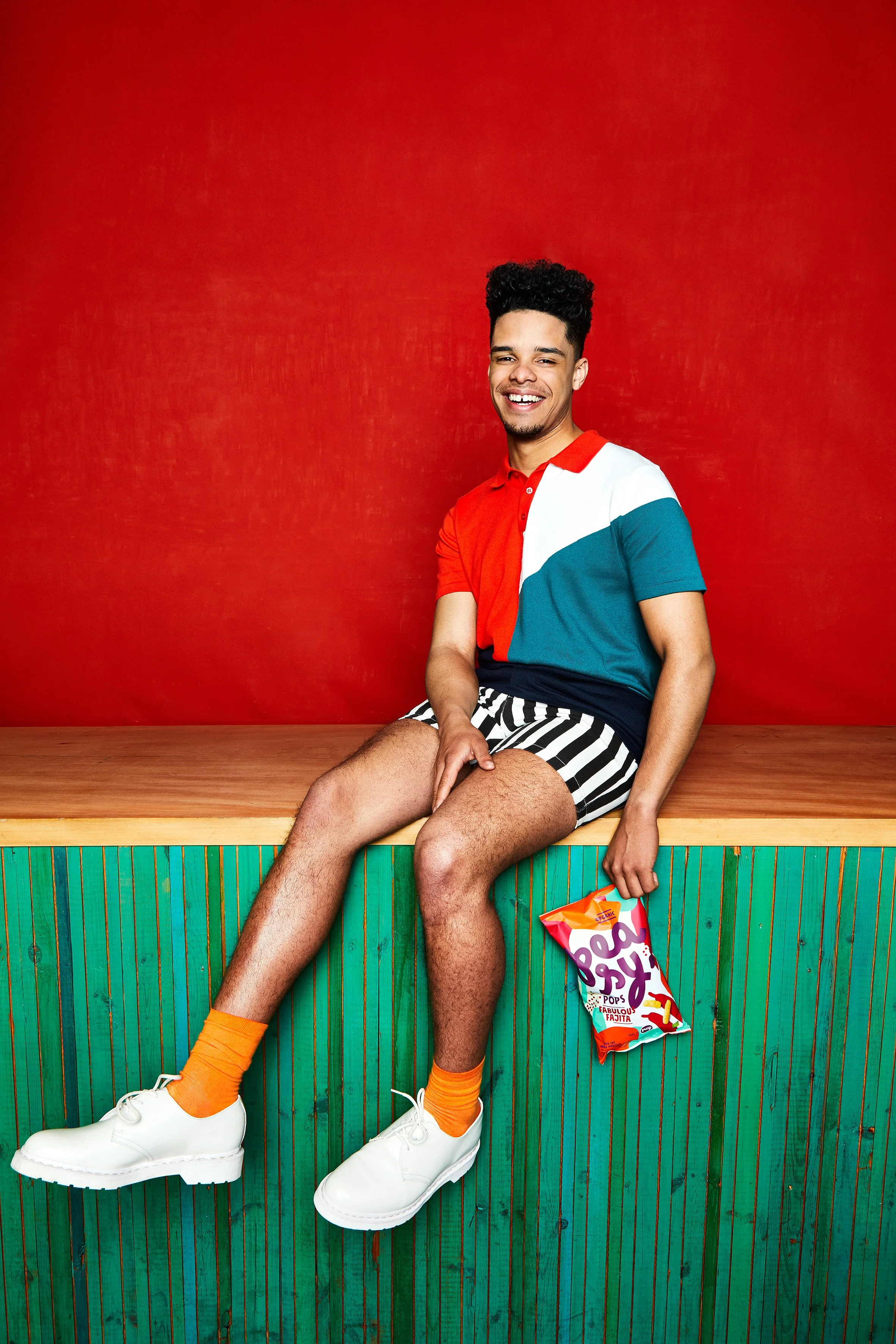 A young man sitting on a wooden ledge against a red wall, smiling, wearing a color-blocked polo shirt, striped shorts, orange socks, and white shoes, holding a bag of Lay's potato chips.