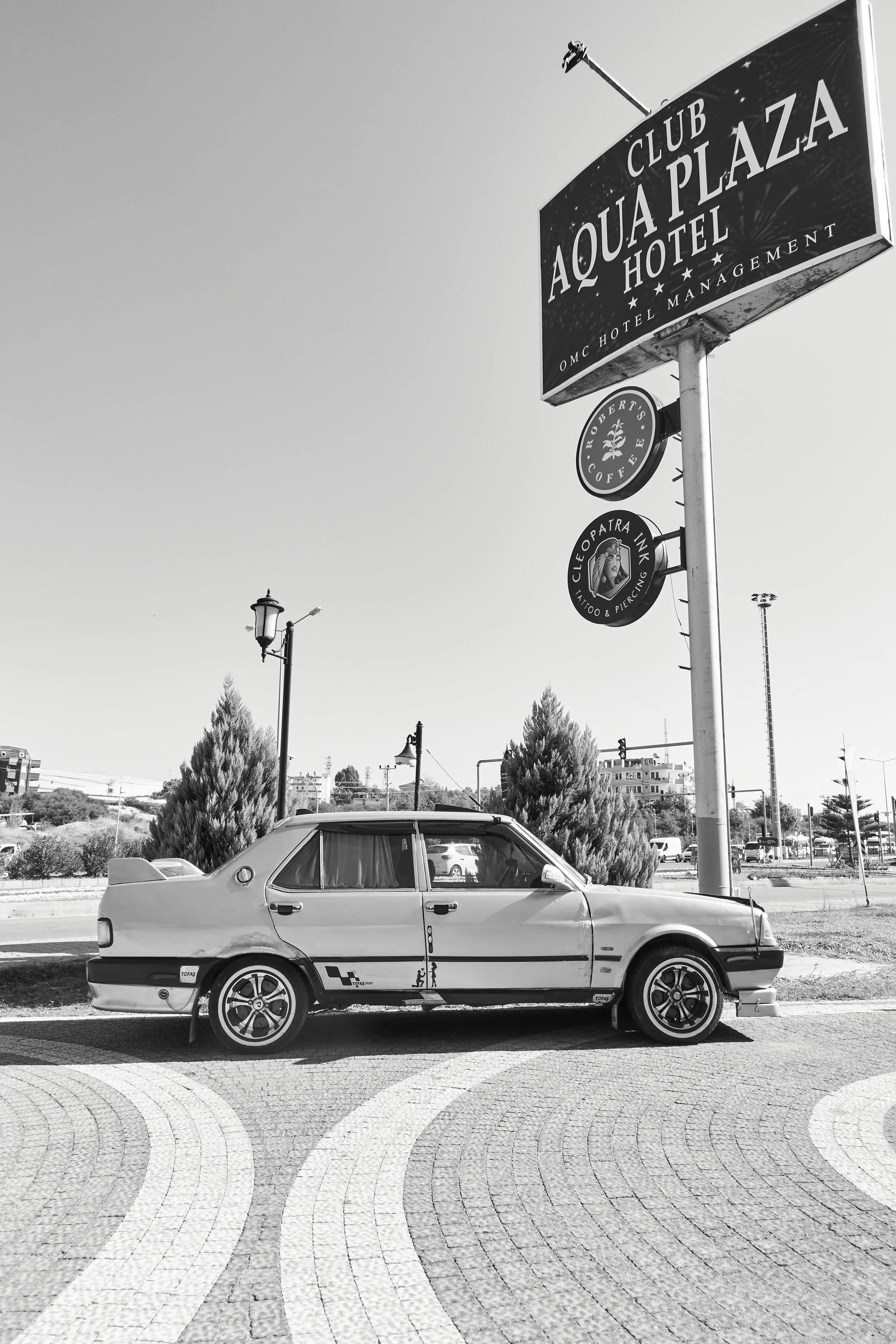 Decorative interior corner with a large potted plant, a black speaker, a yellow donut-shaped object, a framed picture, and a small black camera on a wooden surface, with pink wall and white tiled wall in background.
