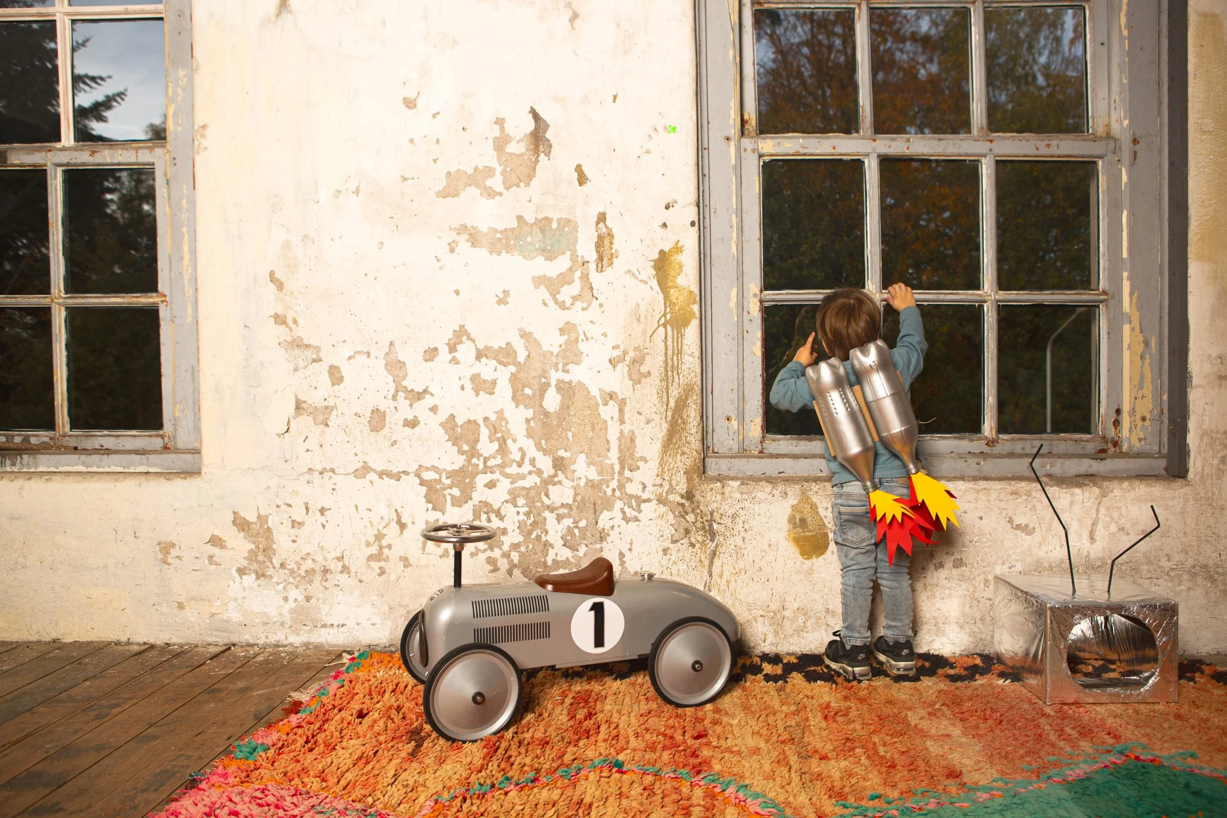 Child looking out of a window with a homemade rocket backpack in an old room with peeling paint, a vintage toy car, and a cardboard box with two straws.