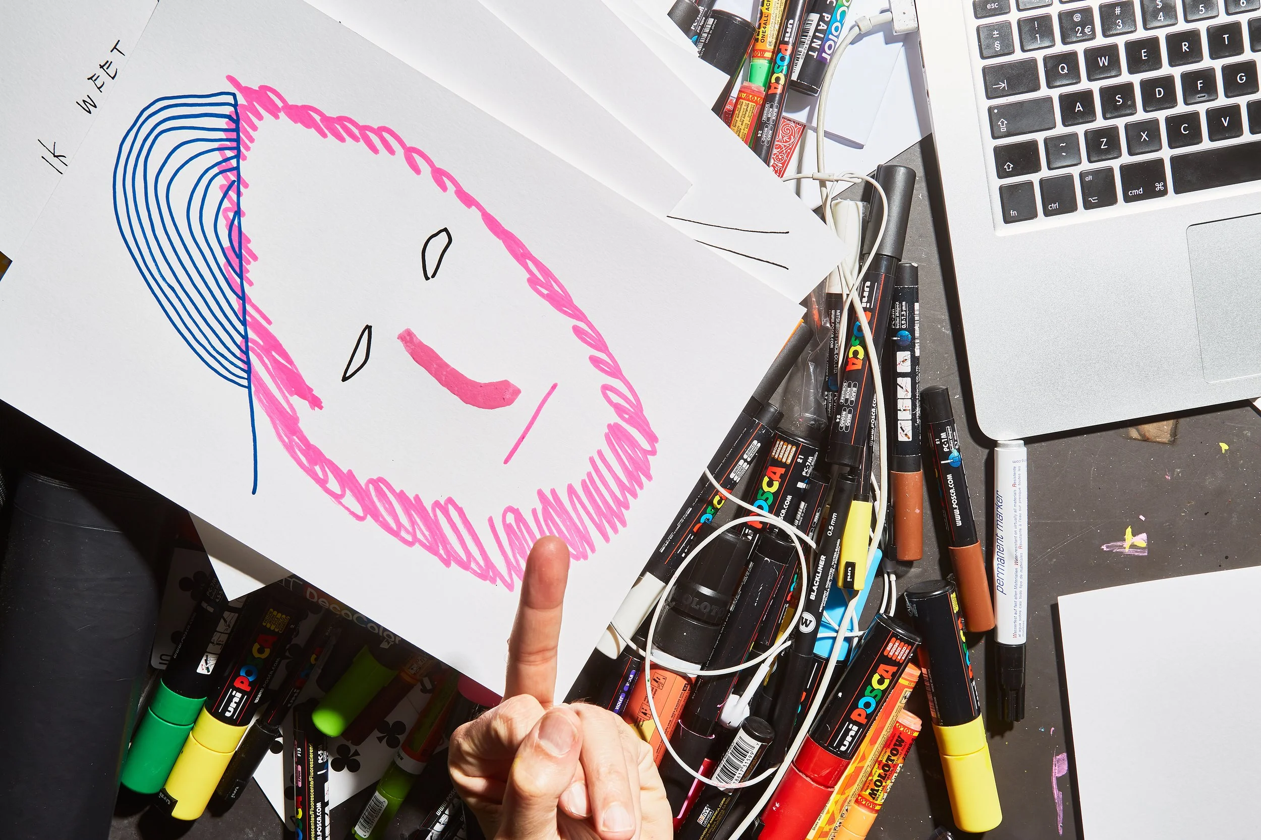 Drawing of a smiling face with pink hair and blue eyes, on a white paper, surrounded by markers and a laptop on a cluttered desk.