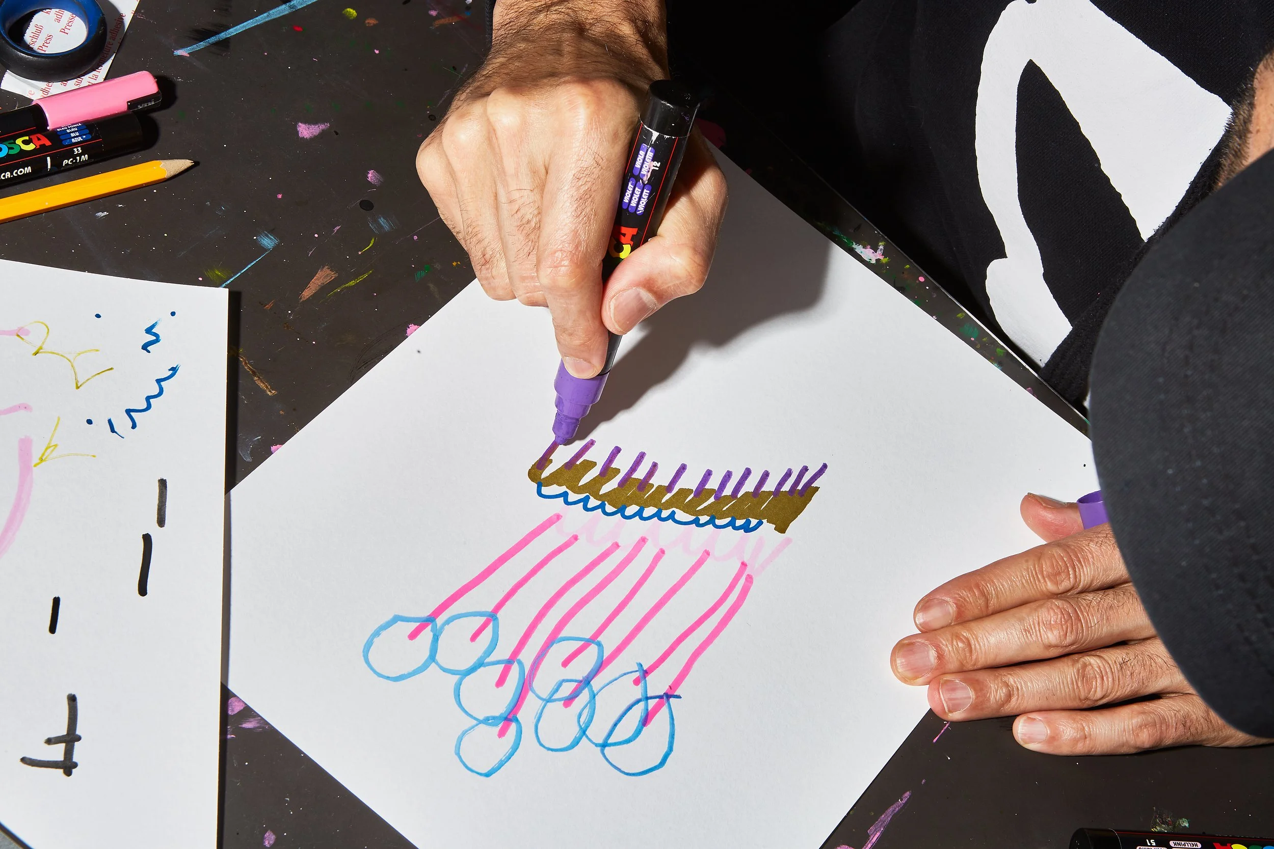 A person creates colorful abstract art on white paper using markers, drawing shapes and lines in multiple colors.
